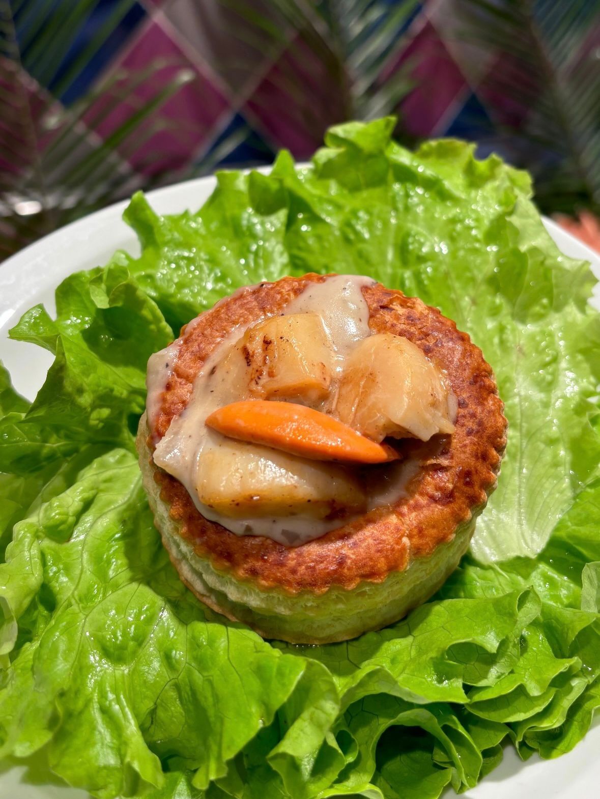 un feuilleté garni de St Jacques , crevettes roses label rouge, champignon ,crème fraiche , échalotes, vin blanc, un pur régal!